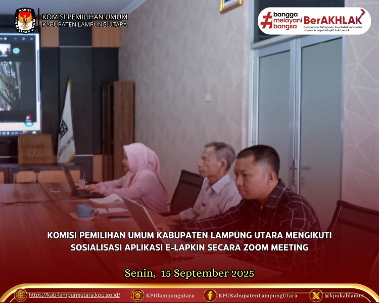 KPU Kabupaten Lampung Utara mengikuti Sosialisasi Aplikasi e-Lapkin yang diselenggarakan oleh KPU RI via daring. (Senin, 15 September 2025)