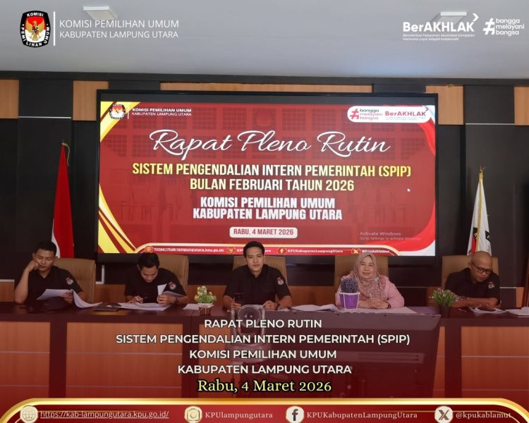Komisi Pemilihan Umum Kabupaten Lampung Utara melaksanakan Rapat Pleno Rutin Sistem Pengendalian Interen Pemerintah (SPIP) bulan Februari 2026 di lingkungan komisi pemilihan umum kabupaten Lampung Utara.