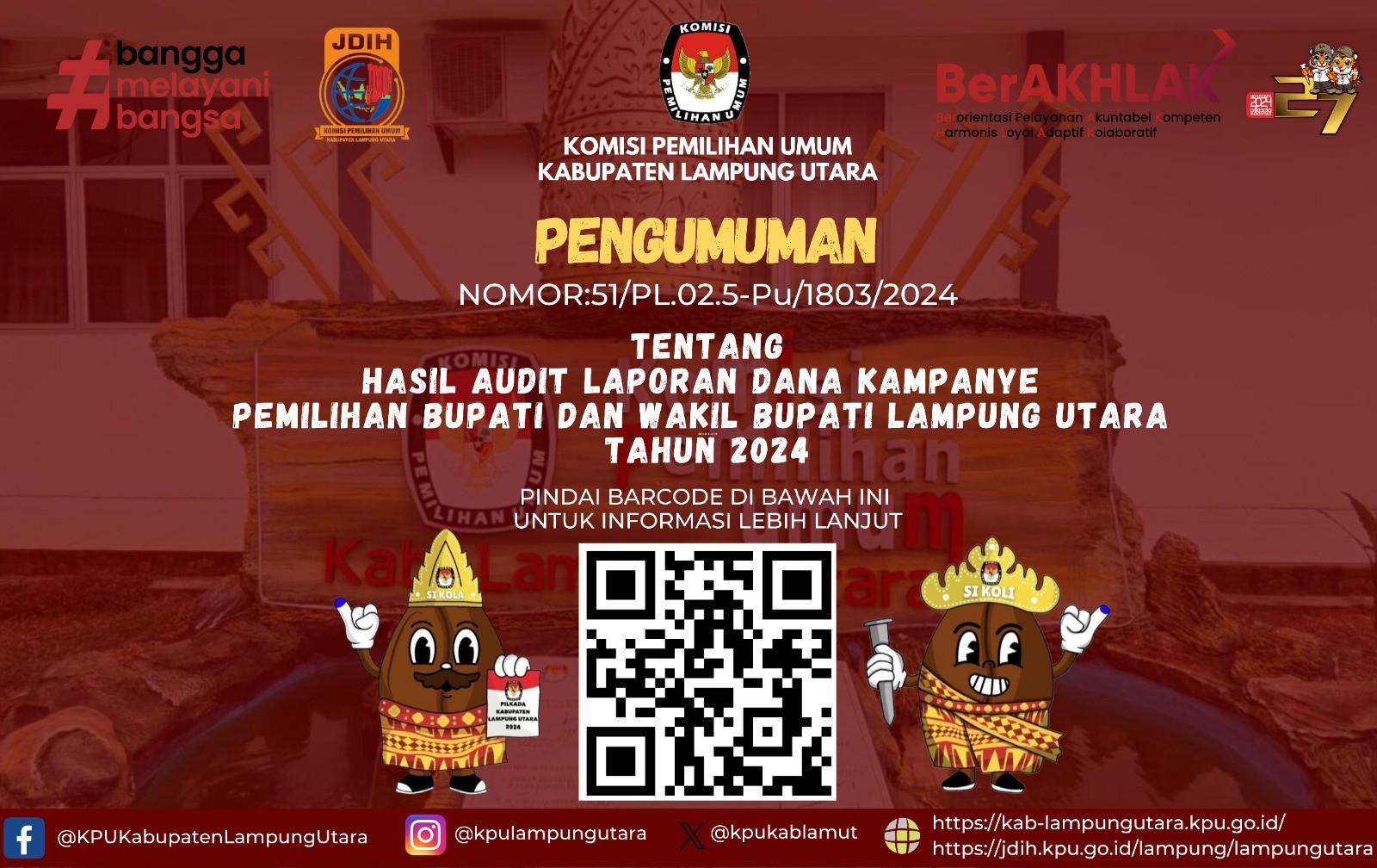 Berikut disampaikan Pengumuman tentang Hasil Audit Laporan Dana Kampanye Pemilihan Bupati dan Wakil Bupati Lampung Utara Tahun 2024.
