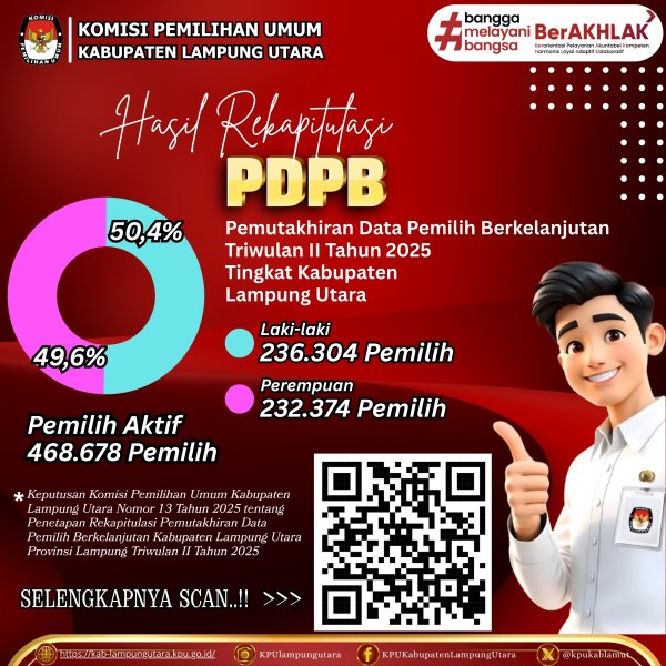 KPU Kabupaten Lampung Utara menyampaikan Hasil Rekapitulasi PDPB Triwulan II Tahun 2025 tingkat Kabupaten Lampung Utara yang telah ditetapkan di rapat pleno terbuka pada 2 Juli 2025, dapat dilihat di info grafis berikut atau >>KLIK DISINI<<.. terimakasih