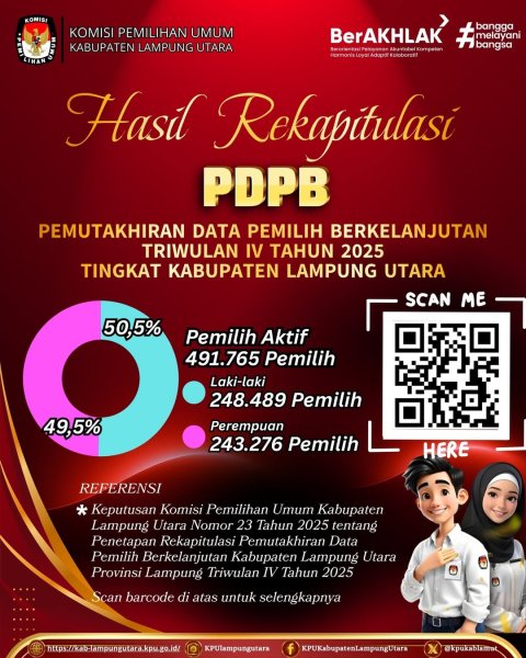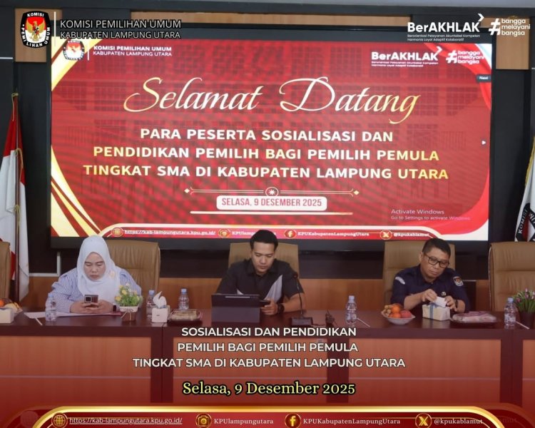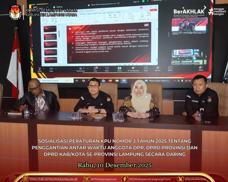 Komisi Pemilihan Umum Kabupaten Lampung Utara menyelenggarakan Rapat Pleno Terbuka Rekapitulasi Pemutakhiran Data Pemilih Berkelanjutan (PDPB) Triwulan IV Tahun 2025 Tingkat Kabupaten Lampung Utara, bertempat di Aula Kantor KPU Kabupaten Lampung Utara.
