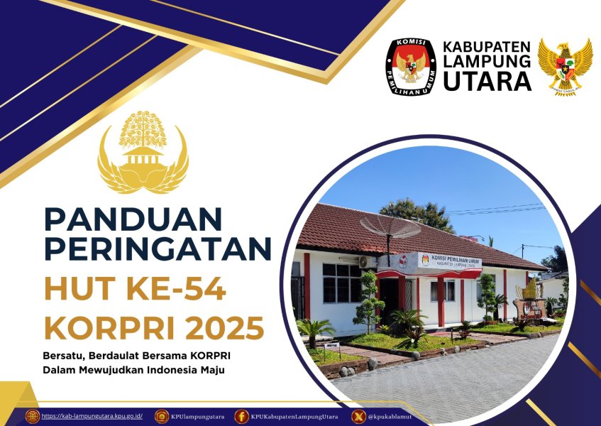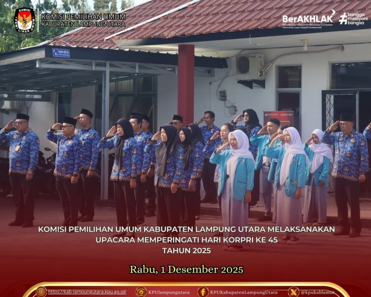 temanpemilih, Komisi Pemilihan Umum (KPU) Kabupaten Lampung Utara melaksanakan Upacara Peringatan Hari Ulang Tahun Korps Pegawai Republik Indonesia (KORPRI) ke-54 Tahun 2025 yang kali ini mengangkat tema “Bersatu, Berdaulat bersma Korpri Dalam Mewujudkan Indonesia maju" bertempat di halaman kantor KPU Kabupaten Lampung Utara. Senin, 1 Desember 2025.