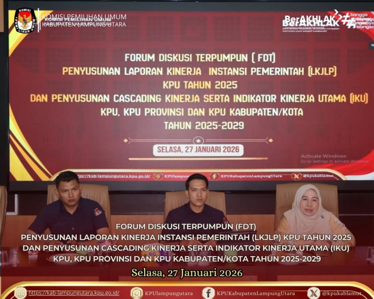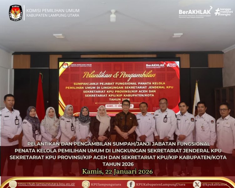 Komisi Pemilihan Umum (KPU) Kabupaten Lampung Utara mengikuti kegiatan Pelantikan dan Pengambilan Sumpah/Janji Pejabat Fungsional Penata Kelola Pemilu di lingkungan Sekretariat Jenderal KPU, Sekretariat KPU Provinsi, serta Sekretariat KPU Kabupaten/Kota Tahun 2026 yang dilaksanakan secara daring. Kamis, 22 Januari 2026.