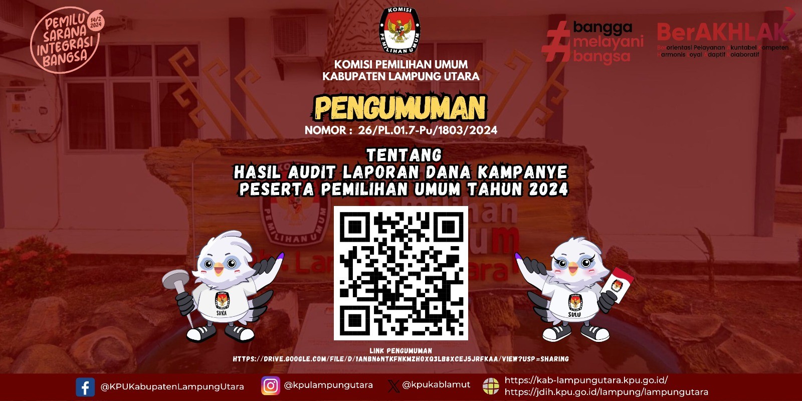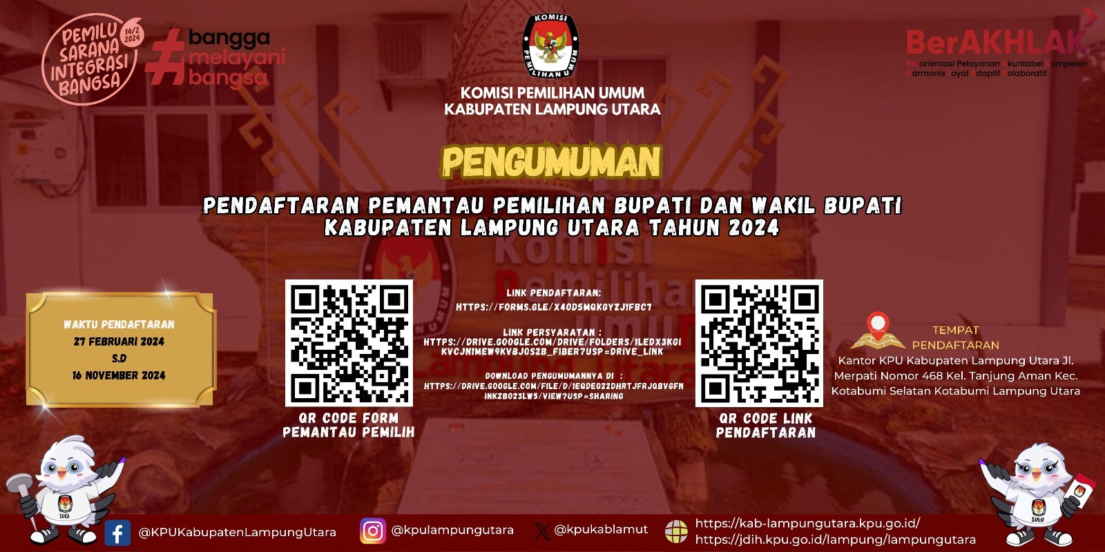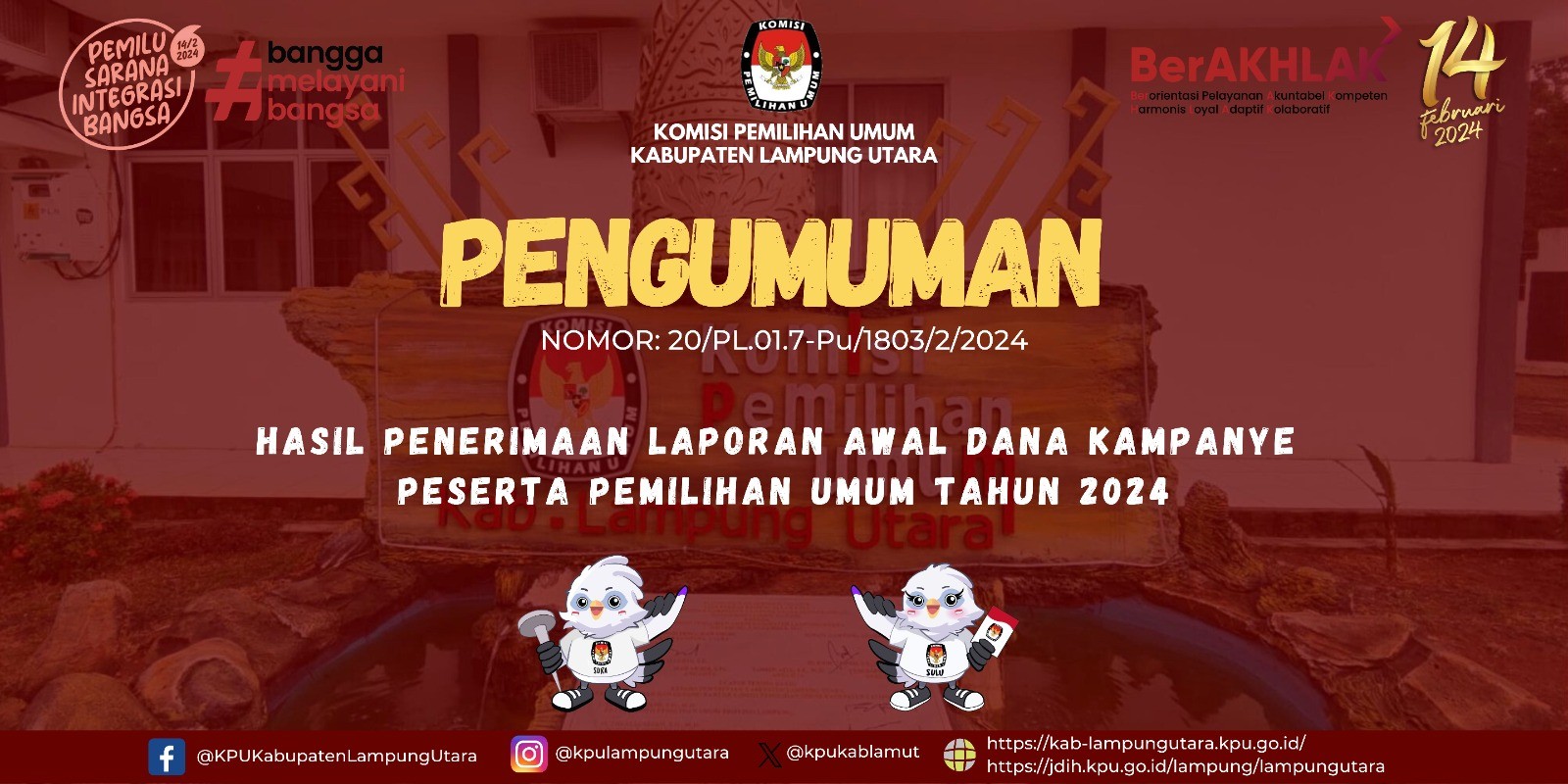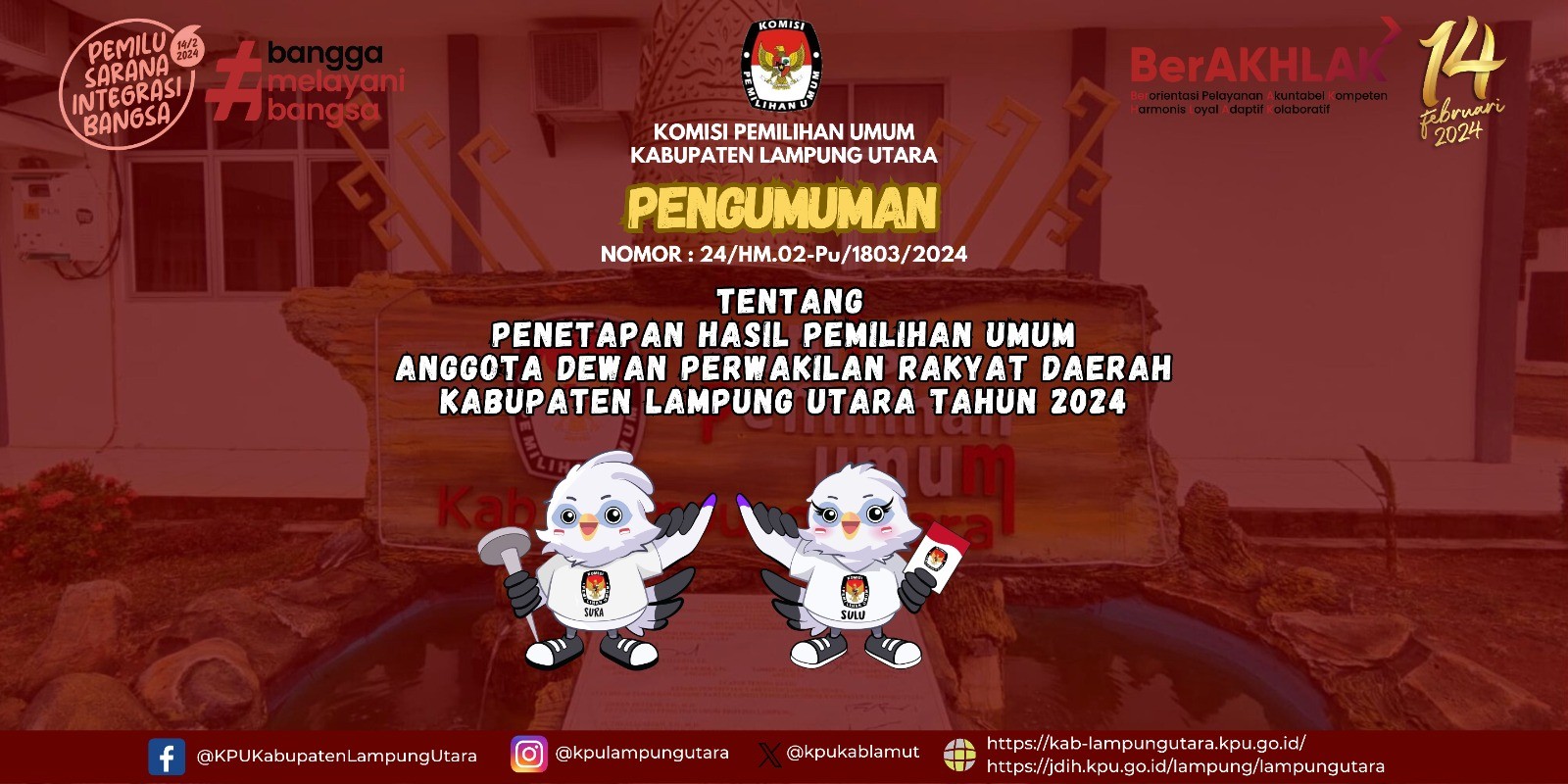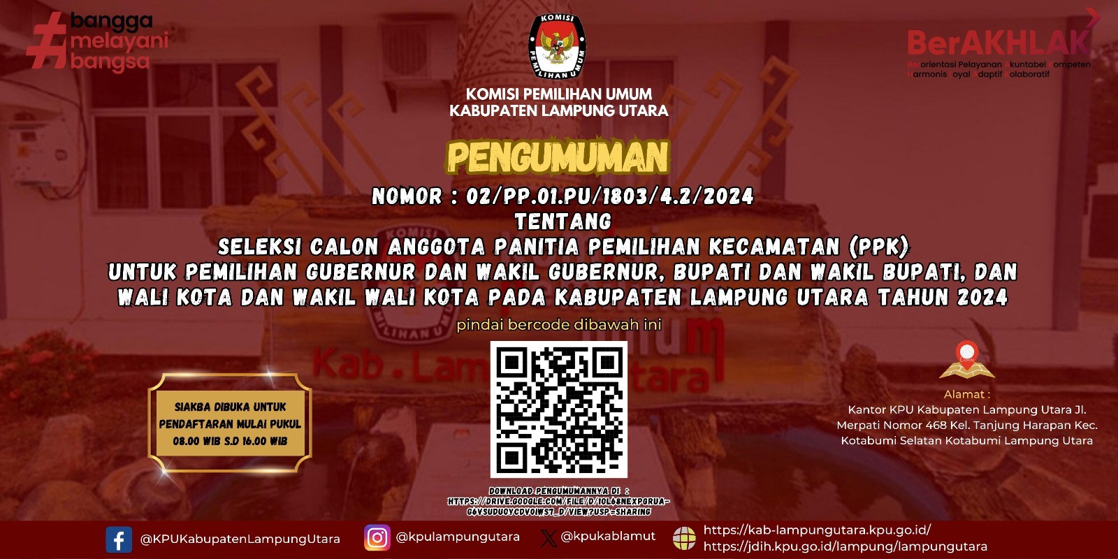 Pengumuman Nomor : 02/PP.01.PU/1803/4.2/2024 Tentang Seleksi Calon Anggota Panitia Pemilihan Kecamatan (PPK) untuk Pemilihan Gubernur dan Wakil Gubernur, Bupati dan Wakil Bupati, dan Wali Kota dan Wakil Wali Kota pada Kabupaten Lampung Utara Tahun 2024.
