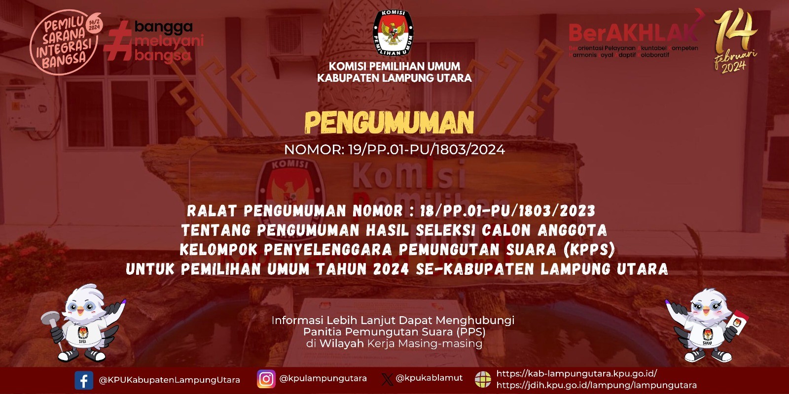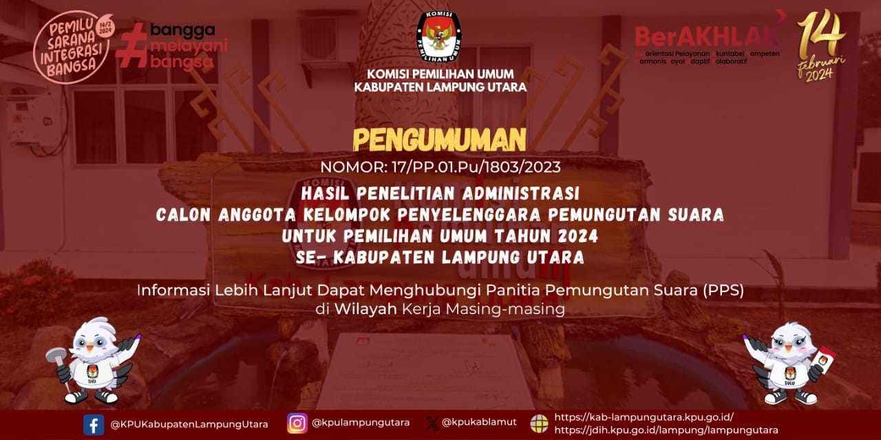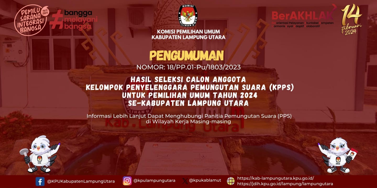 #TemanPemilih, Berikut disampaikan Pengumuman Nomor: 19/PP.01-PU/1803/2024 tentang Ralat Pengumuman Nomor 18/PP.01-PU/1803/2023 tentang Hasil Seleksi Calon Anggota Kelompok Penyelenggara Pemungutan Suara (KPPS) untuk Pemilihan Umum Tahun 2024 Se- Kabupaten Lampung Utara.