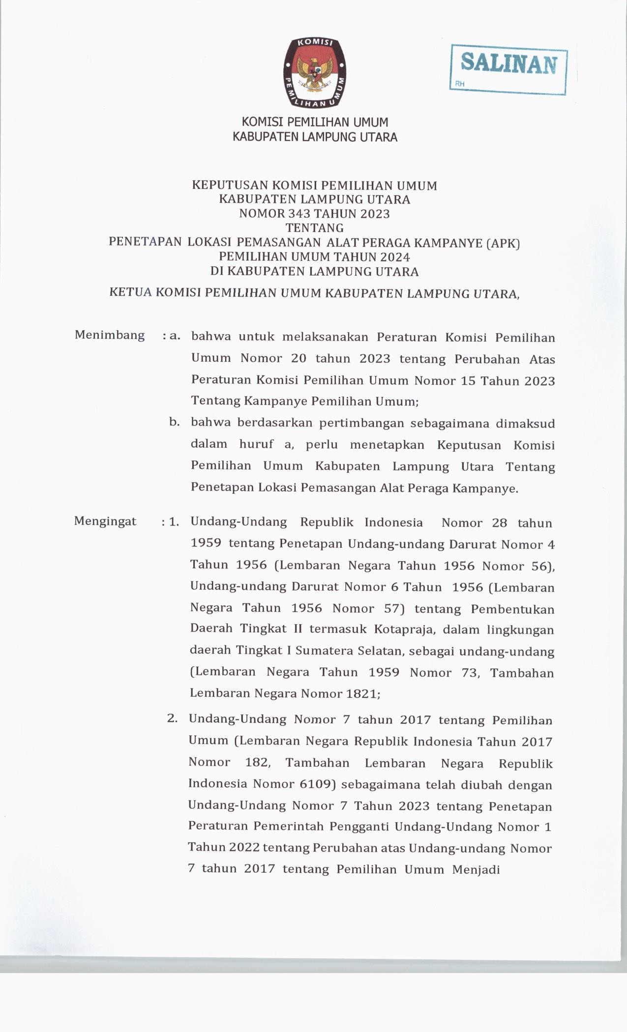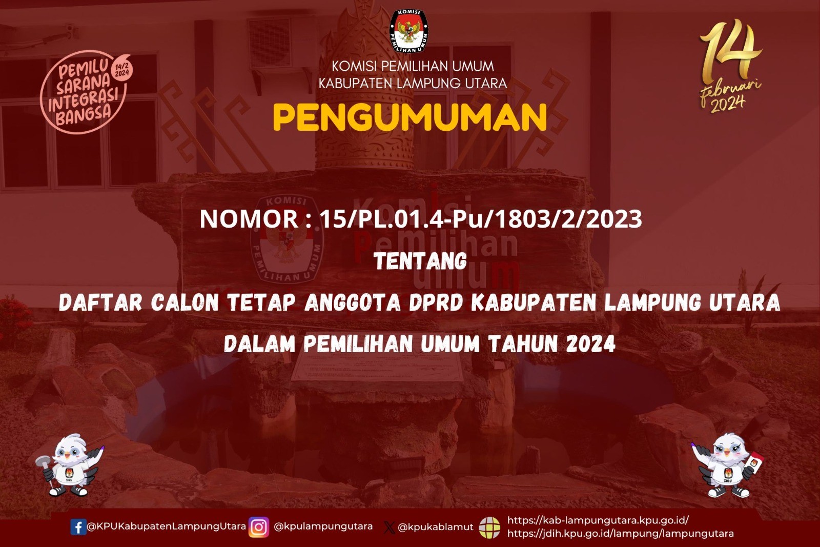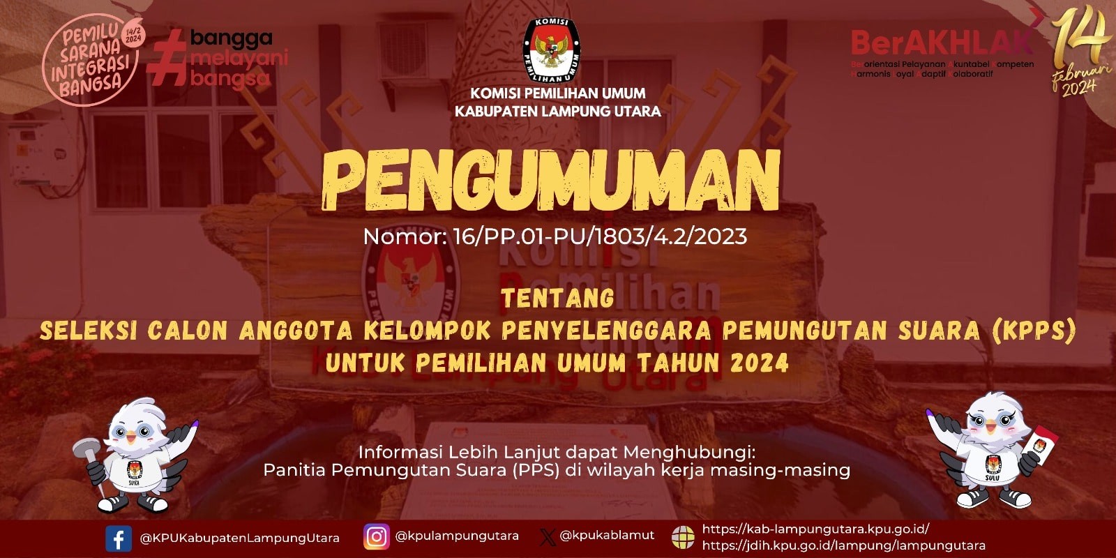 #TemanPemilih, Berikut disampaikan Pengumuman Nomor: 19/PP.01-PU/1803/2024 tentang Ralat Pengumuman Nomor 18/PP.01-PU/1803/2023 tentang Hasil Seleksi Calon Anggota Kelompok Penyelenggara Pemungutan Suara (KPPS) untuk Pemilihan Umum Tahun 2024 Se- Kabupaten Lampung Utara.