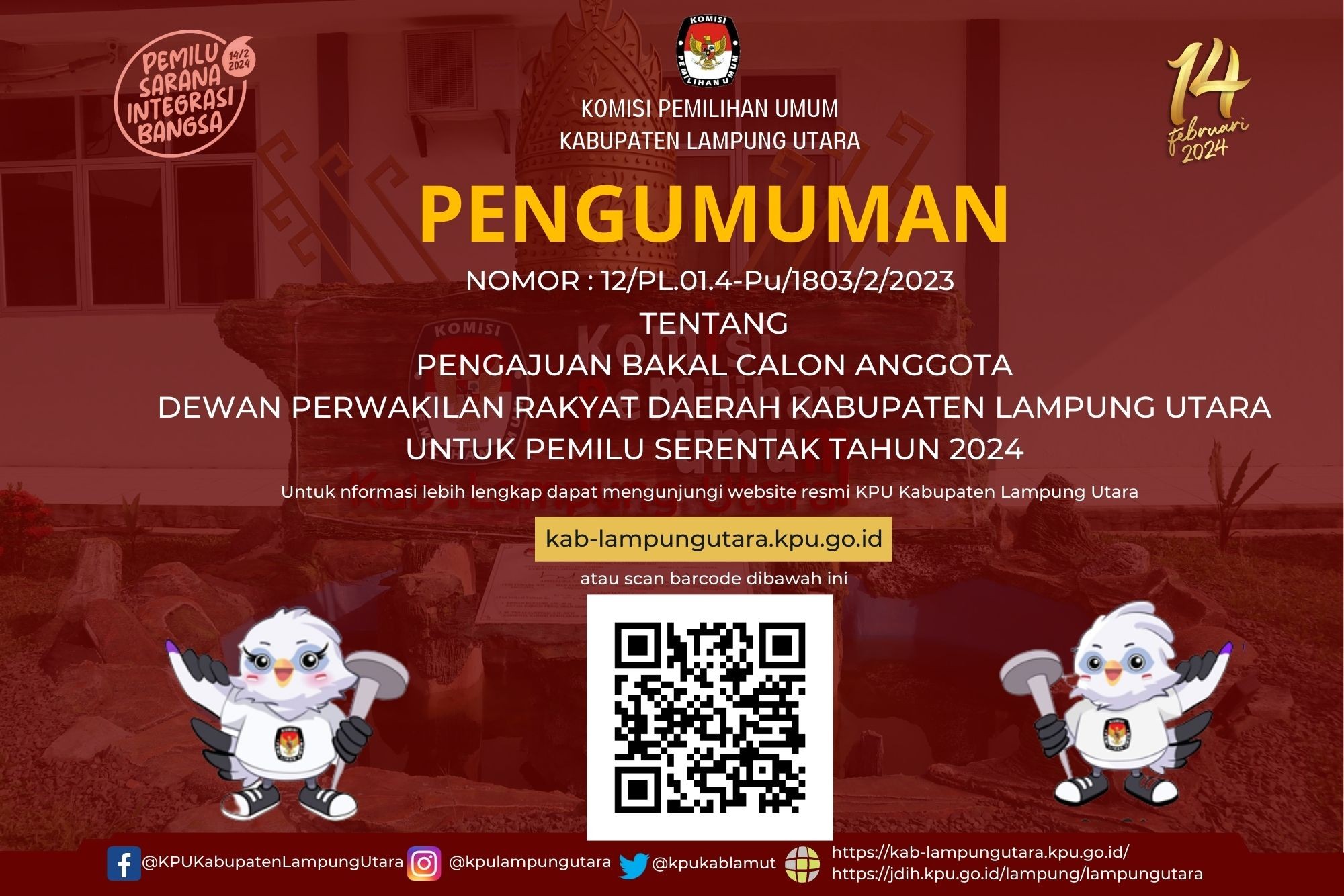 #TemanPemilih, Komisi Pemilihan Umum Kabupaten Lampung Utara membuka penerimaan pengajuan bakal calon anggota Dewan Perwakilan Rakyat Daerah (DPRD) Kabupaten Lampung Utara untuk Pemilu Serentak Tahun 2024 melalui Partai Politik Peserta Pemilu pada Kepengurusan tingkat Provinsi/Kabupaten/Kota. Selengkapnya klik link berikut