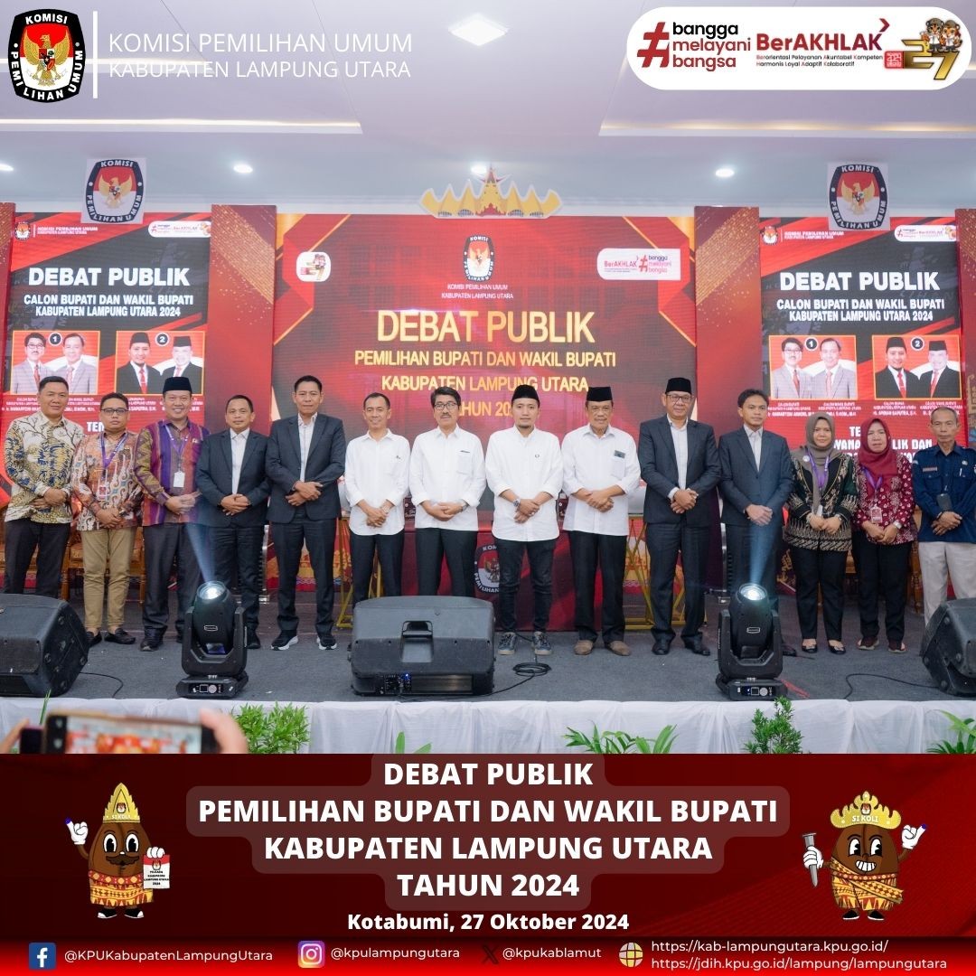 #TemanPemilih, Komisi Pemilihan Umum (KPU) Kabupaten Lampung Utara mengadakan kegiatan Debat Publik Pemilihan Bupati dan Wakil Bupati Kabupaten Lampung Utara Tahun 2024 di Universitas Muhammadiyah Kotabumi, (27 Oktober 2024).