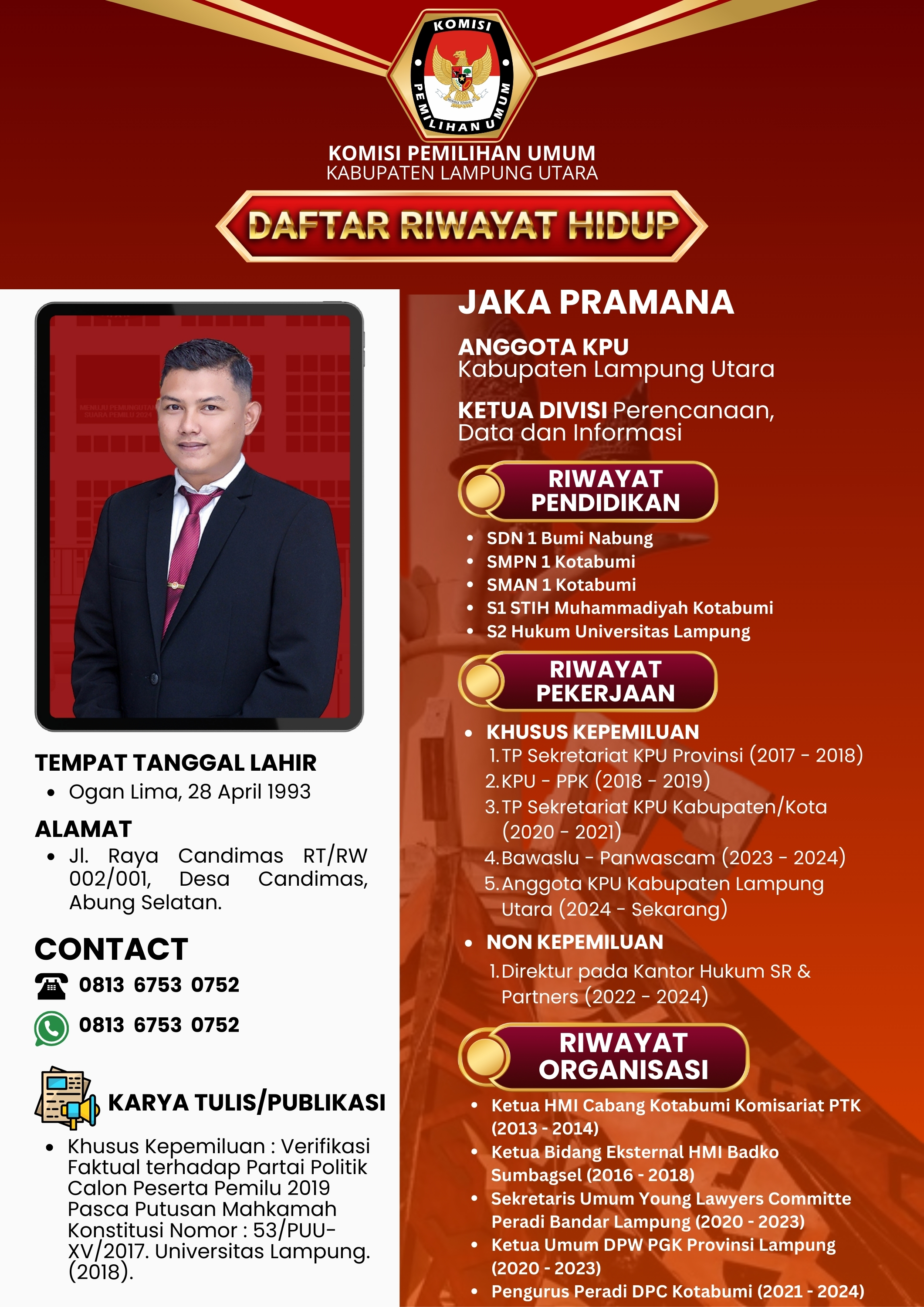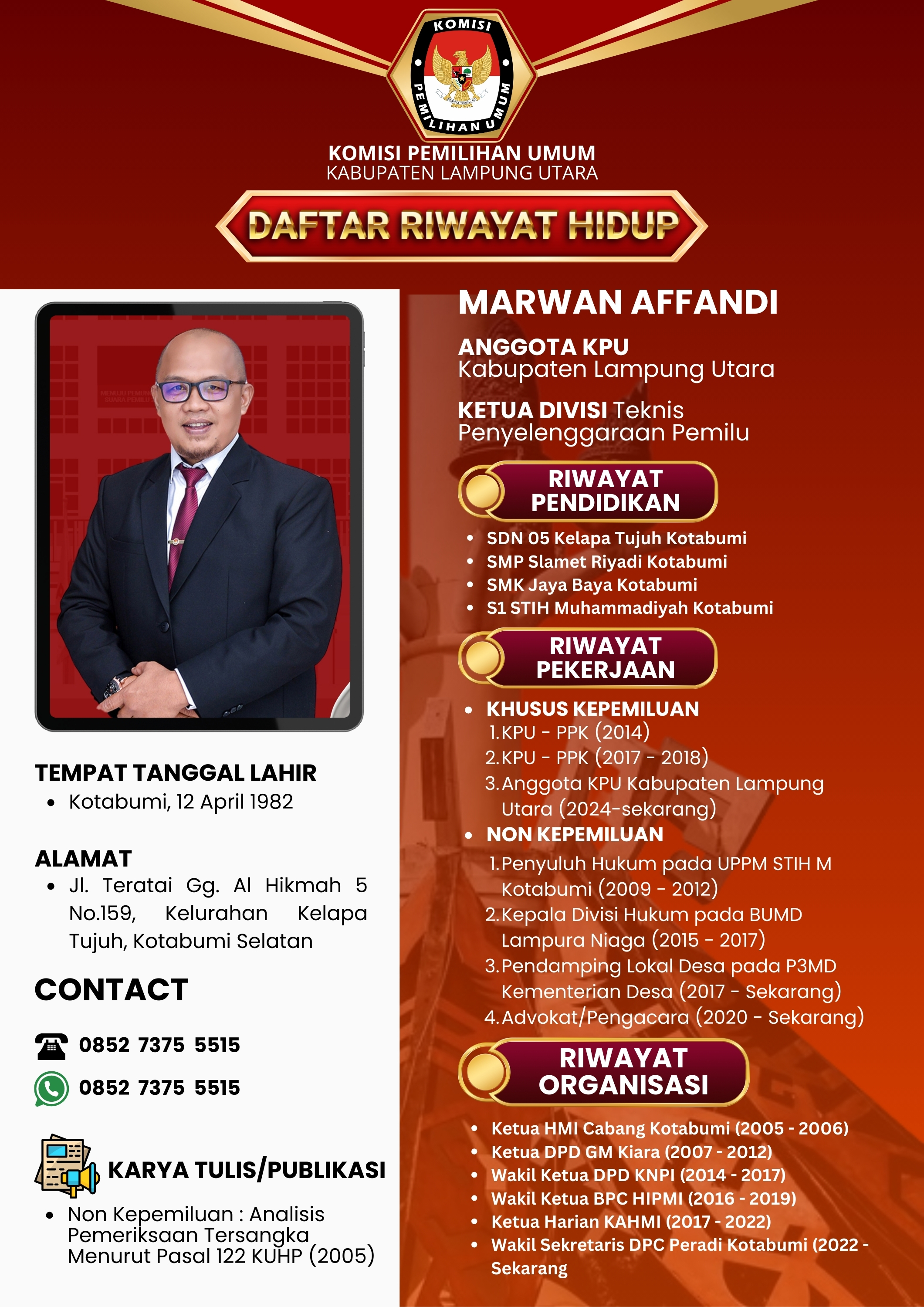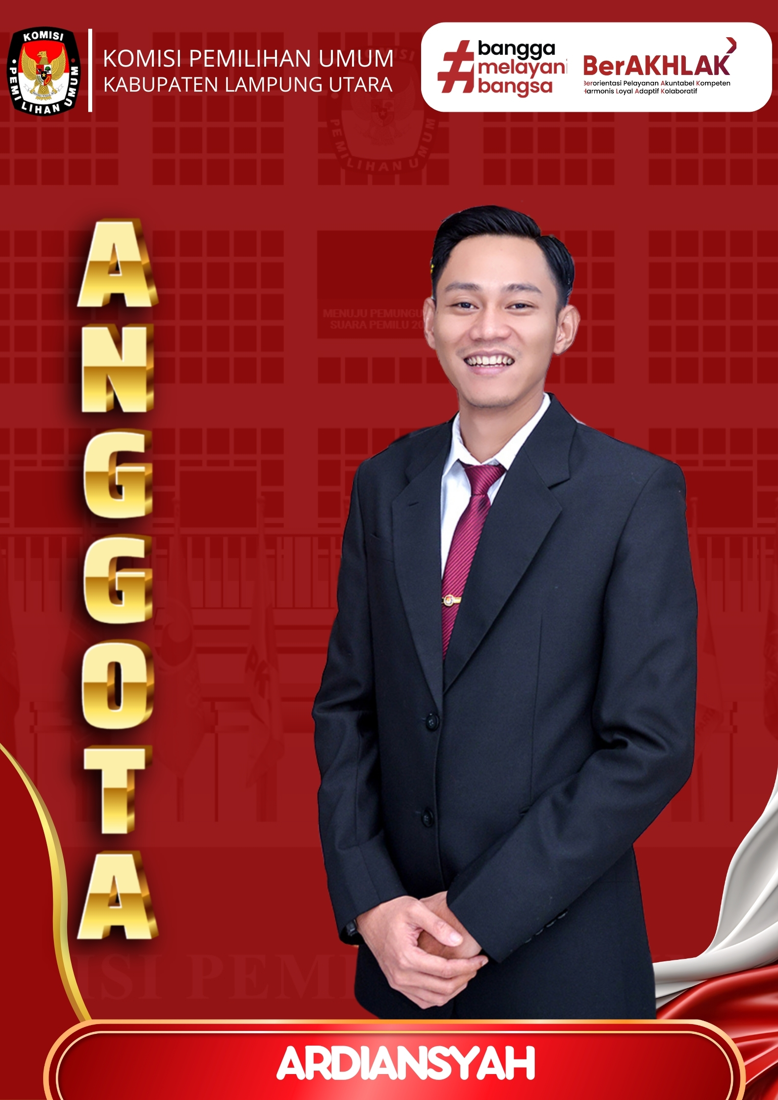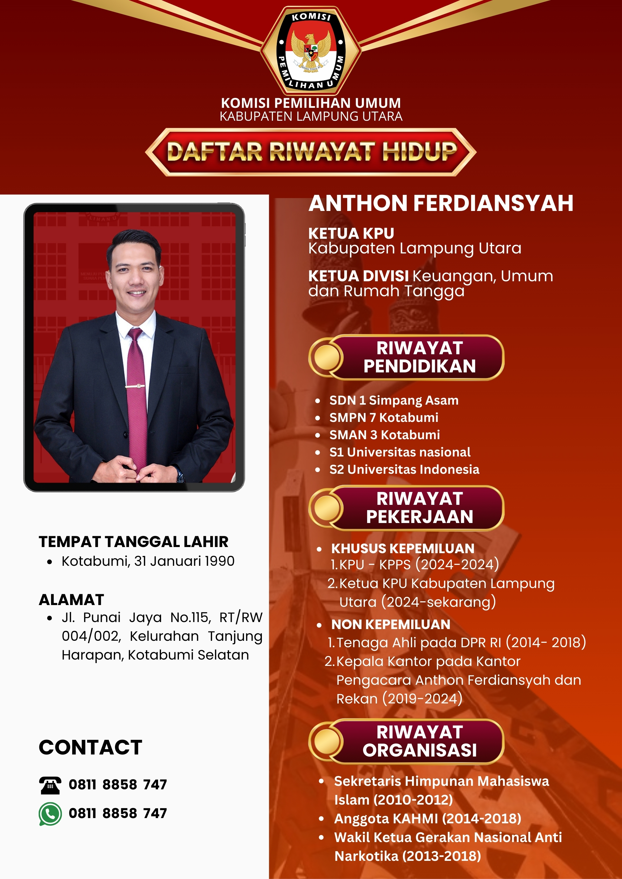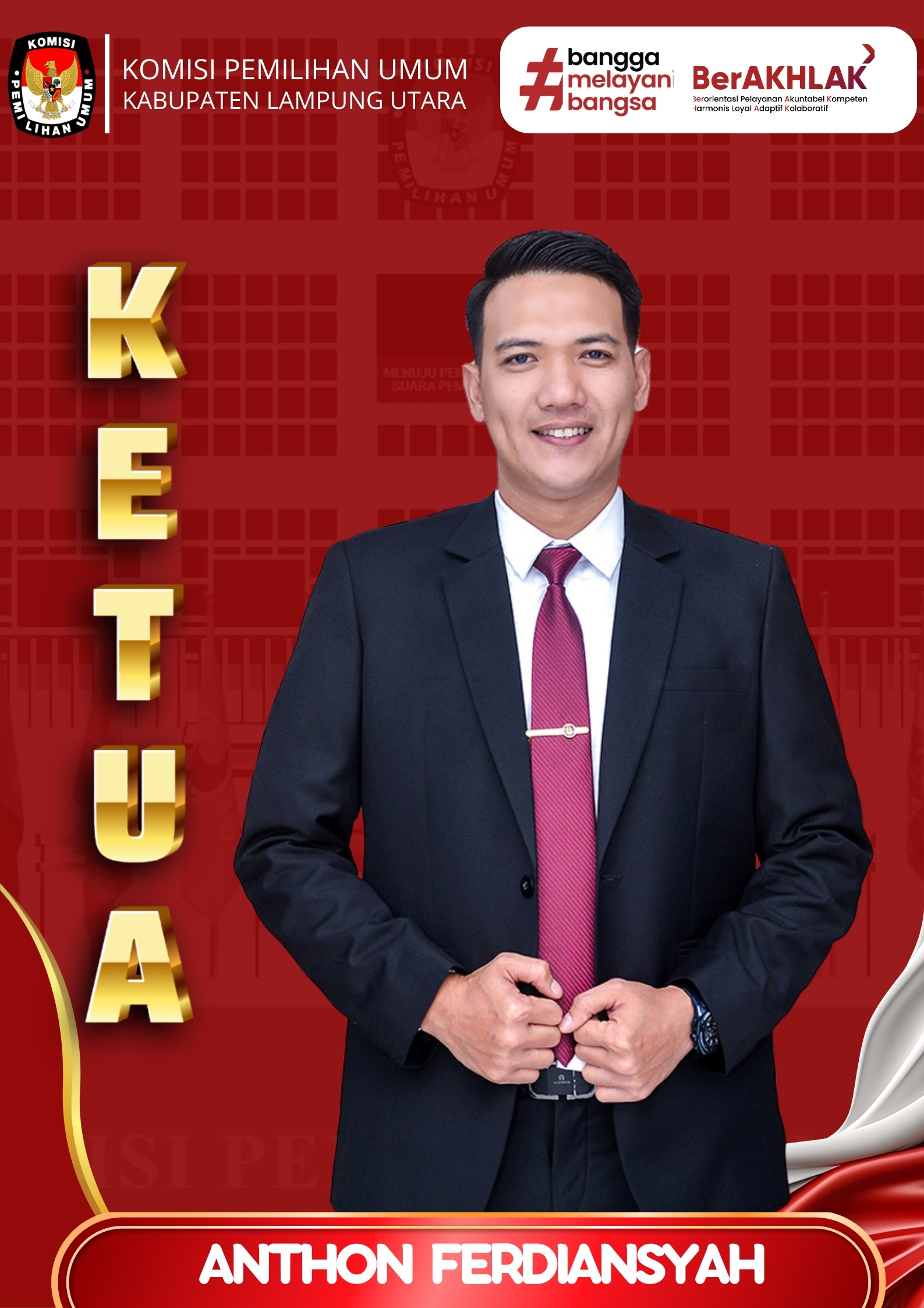 Profil Anggota KPU Profil Anggota Komisi Pemilihan Umum Kabupaten Lampung Utara: 1. Anthon Ferdiansyah (Ketua) 2. Marwan Affandi (Anggota) 3. Arieska Selvianita (Anggota) 4. Jaka Pramana (Anggota) 5. Ardiansyah (Anggota) Share this artikel : Dilihat 392 Kali.